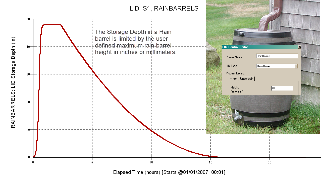 The storage depth in a Rain Barrel LID is limited by the user defined maximum rain barrel height in inches or millimeters. A rain barrel is one of the new LID features in SWMM 5.0.021