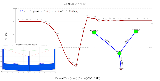 In this example, a large flow from Upnode_2 causes a high head at node Middle which causes a reverse flow up link UpPipe1 to node UpNode_1.  The image show here shows the flow in Link UpPipe1