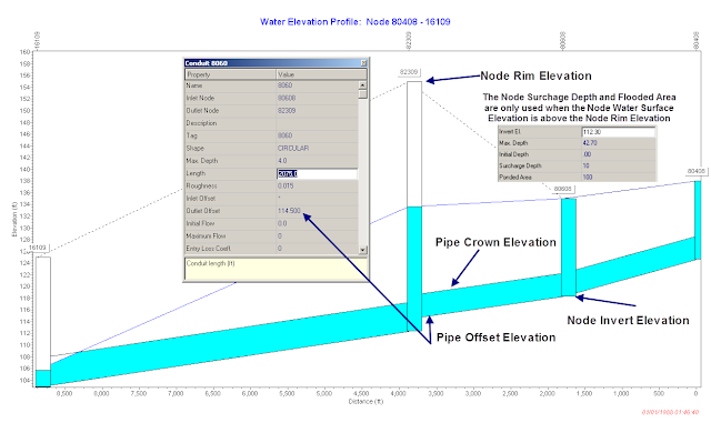 · The Pipe Crown Cannot be above the Rim Elevation of the Node – the program will raise the Rim Elevation when this happens and print a warning in the rpt file.
