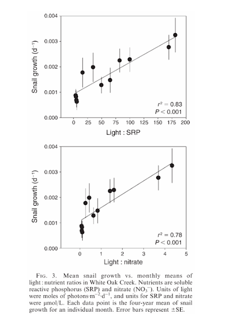 A paper just published in Ecology by Hill et al. (2010; full cite below) seeks to investigate whether this occurs for snails growing on periphyton in streams. The authors looked at snail growth in two streams for several years, and primarily looked for evidence of that hypothesized unimodal relationship between light and growth. They did this by measuring the nutrient content of algae, the amount of light, estimating algal productivity, and the amount of growth in snails from month to month.
