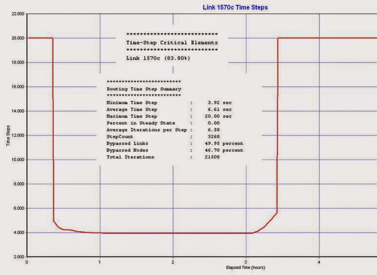 The time step critical elements in the SWMM 5 report text output file tells you which elements were controlling the time step during the simulation. If no element was controlling the time step then the program will just use the maximum time step. For example, if the maximum time step was 10 seconds and the average time step was 9.8 then only a few time steps were set by a link or node that needed a smaller than maximum time step (Figure 1). If the maximum time step for the same simulation was 30 seconds then many links and nodes will set the time step (Figure 2).