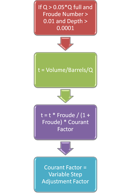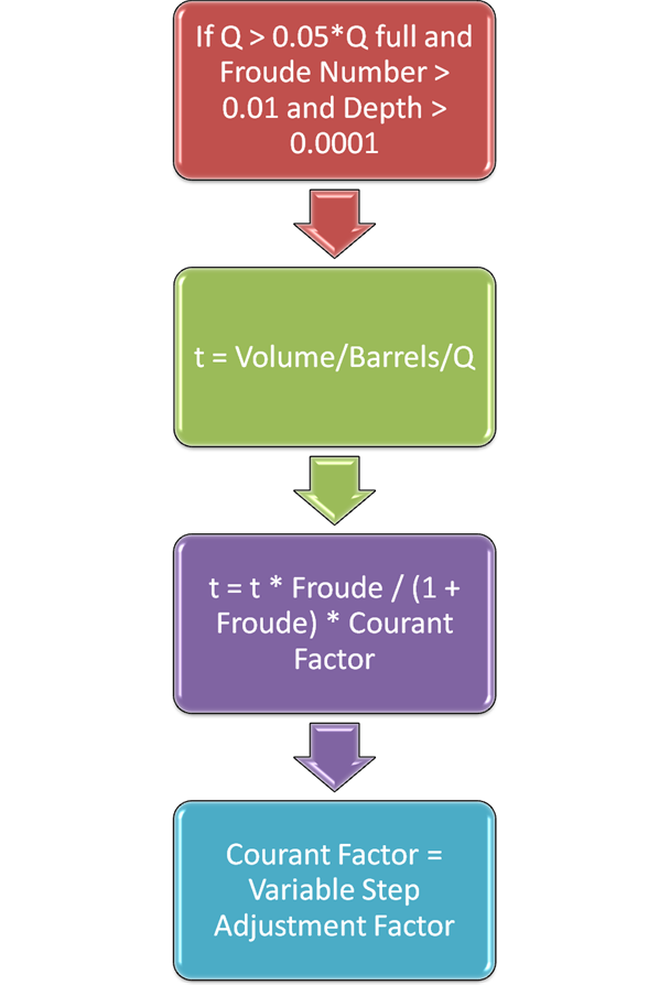 It you select the variable time step option in SWMM 5 then the program will compute the CFL time step for each link based on the ending system variables in the last time step based on the following steps. The smallest value of t is used for each time step but often the same small set of links will be the controlling time for the whole simulation. In the example shown below link 1570c is controlling the time step 83 percent of the time. The link time step is usually the controlling time step.